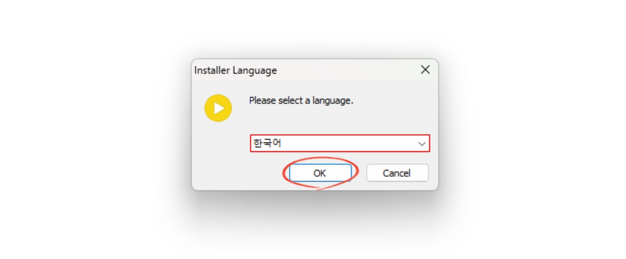 4. 언어 선택에서 '한국어'를 선택하고 'OK'를 클릭합니다.